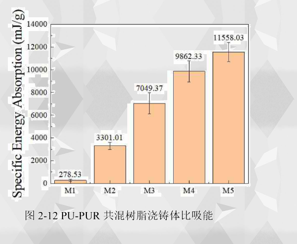 壓縮彈性模量表現(xiàn)材料在壓縮荷載作用下彈性變形的能力大小,反應(yīng)出材料發(fā)生彈性變形的難易程度。從圖2-11(a)中得到,樹脂澆鑄體的壓縮彈性模量隨著聚脲組分的增 加而不斷增加,這和拉伸彈性模量的增加趨勢(shì)一致。M1聚氨酯的壓縮彈性模量數(shù)值較低,為4.83MPa。M2樹脂澆鑄體的壓縮彈性模量為14.70MPa,相比聚氨酯增加了204.35%。M3樹脂澆鑄體的壓縮彈性模量為34.03MPa,相比M2增加了131.50%。M4樹脂澆鑄體的壓縮彈性模量為248.43MPa,相比M3增加了630.03%??梢钥闯?,M3的壓縮彈性模量增幅很大,在聚脲所占比例達(dá)到50%后,彈性模量的提升更加明顯,說(shuō)明此時(shí)聚脲成分在樹脂澆鑄體中占據(jù)主要作用,支撐起了材料的結(jié)構(gòu),使得樹脂澆鑄體抵抗彈性變形的能力得到極大增強(qiáng)。M5聚脲的壓縮彈性模量最高,為832.54MPa。壓縮強(qiáng)度表示材料抵抗壓縮載荷而不失效的能力,在聚脲組分占混合樹脂的比例不斷增加的過(guò)程中,材料的塑性特征越來(lái)越明顯,其壓縮強(qiáng)度也不斷增強(qiáng)。從圖2-11(b)中得到M1聚氨酯的壓縮強(qiáng)度較低,為1.71MPa。M2樹脂澆鑄體的壓縮強(qiáng)度為13.31MPa,相比比聚氨酯增加了678.36%。M3樹脂澆鑄體的壓縮強(qiáng)度為34.88MPa,相比M2增加了162.06%。M4的壓縮強(qiáng)度為42.65MPa,相比M3增加了22.28%。M5聚脲的壓縮強(qiáng)度為42.09MPa??梢钥闯?,在聚脲所占比例在50%以下的時(shí)候,樹脂澆鑄體壓縮強(qiáng)度增加非常明顯,而聚脲所占比例在50%以上的時(shí)候,其壓縮強(qiáng)度增加有限,M3、M4和M5的壓縮強(qiáng)度較為接近且大于M1和M2樹脂澆鑄體,M4和M5壓縮強(qiáng)度最高且相差很小。
