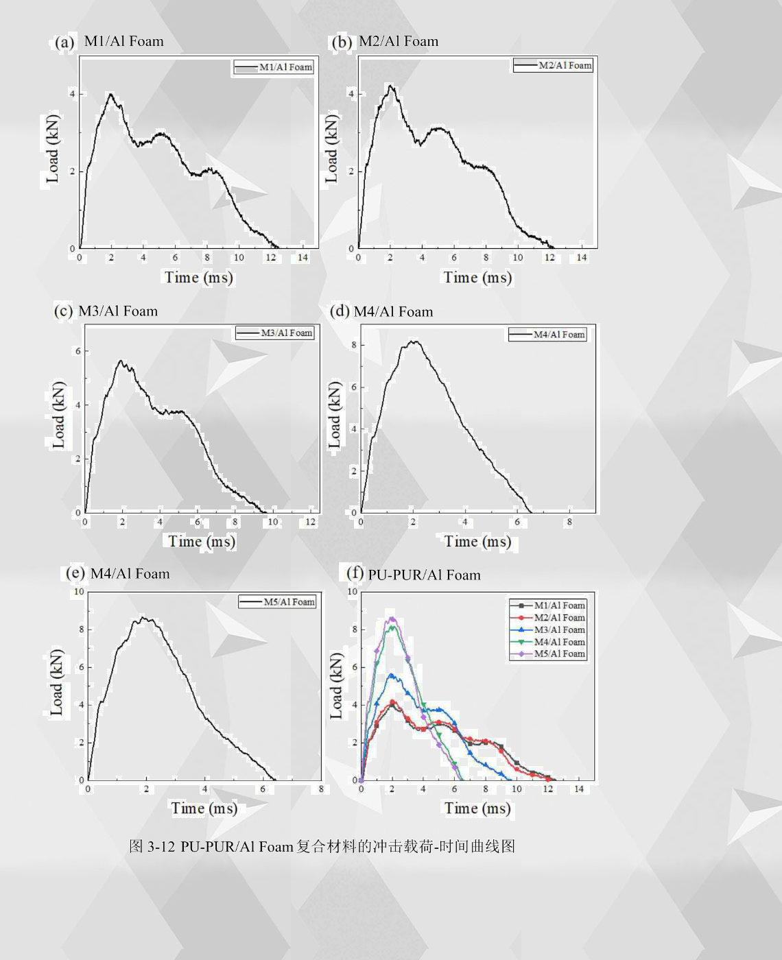 綜合從載荷-時間曲線來看,M4/Al Foam和M5/Al Foam的到達峰值載荷時間更快,峰值載荷都很高,沖擊持續(xù)時間較短,說明這兩種復合材料在受到沖擊荷載時可以更快速地響應而具有更高的抗沖擊能力。