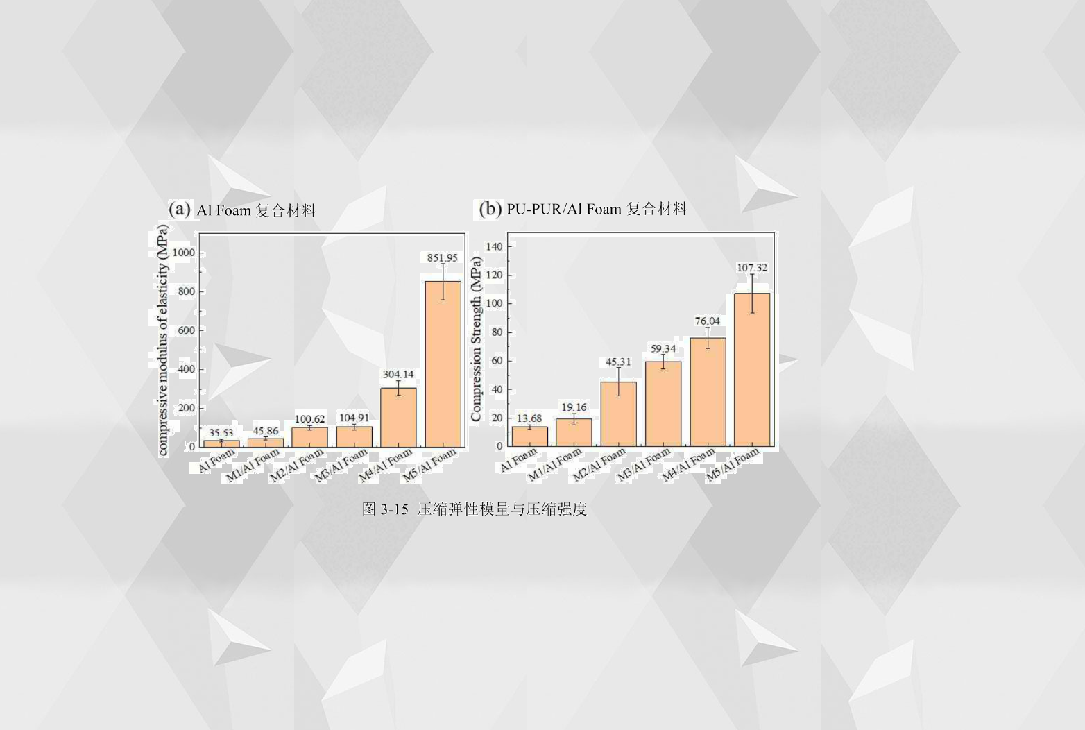 壓縮強度表示材料抵抗壓縮載荷而不失效的能力,從圖3-15(b)中看到,PU-PUR/Al Foam復合材料的壓縮強度都隨著聚脲含量的增大而提高。Al Foam的壓縮強度為13.68MPa,而M1/Al Foam的壓縮強度為19.16 MPa,比Al Foam增加了40.05%。M2/Al Foam的壓縮強度為45.31MPa,比M1/Al Foam增加了136.48%。M3/Al Foam的壓縮強度為59.34MPa,比M2/Al Foam增加了30.96%。M4/Al Foam的壓縮強度為76.01MPa,比M3/Al Foam增加了28.14%。M5/Al Foam的壓縮強度最高,為107.32MPa,比M4/Al Foam增加了41.13%。