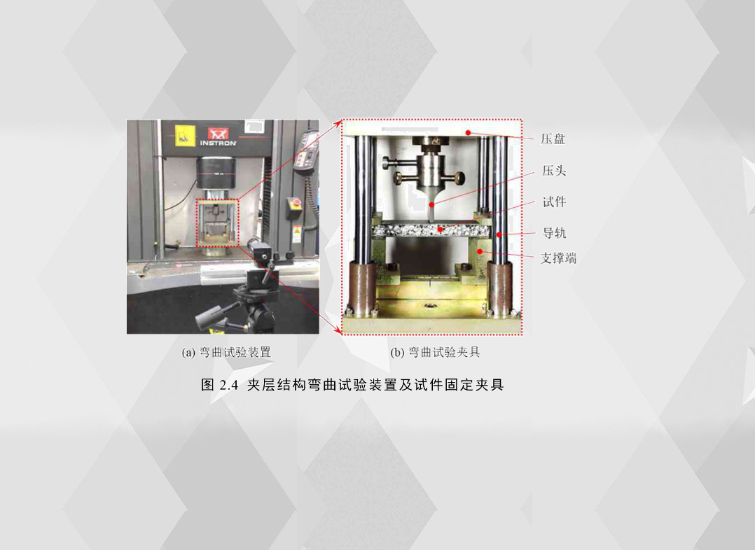 本章所有夾層結(jié)構(gòu)的三點彎曲實驗均在通用試驗機(jī)上進(jìn)行,如圖2.4(a)所示??紤]到夾層結(jié)構(gòu)在汽車結(jié)構(gòu)件中很少以簡支梁的形式存在,比如汽車前后保險杠、B柱等,所以在實驗研究中固定試件對實際研究更有指導(dǎo)意義,此外為了保證壓頭在加載過程中與試件的水平方向保持垂直,設(shè)計了與壓盤剛性連接導(dǎo)軌,試件加載初始狀態(tài)如圖2.4(b)所示,該裝置主要由壓盤、壓頭、導(dǎo)軌、支撐端組成,試件通過兩個固定塊和四個螺栓固定在支撐端上,固定每個試件的螺栓的預(yù)緊力是相同的,并且保證夾緊端泡沫鋁沒有塑性變形。壓頭的沖擊端為半圓柱形,半徑為2.5mm;與試件靠中間接觸的兩支撐端拐角處各有一個半徑為2.5mm的1/4圓弧,兩個1/4圓弧與試件接觸點之間的距離就是跨度為120mm。為了研究彎曲過程的變形機(jī)理及失效模式,實驗中用相機(jī)采集試件的變形和屈曲過程,為了使相機(jī)能清晰地采集圖片,試驗之前采用兩塊面光源對試件進(jìn)行補光。所有夾層結(jié)構(gòu)彎曲試驗的加載速度為2mm/min,在觸發(fā)相機(jī)采集的同時,觸發(fā)實驗加載裝置,使電腦采集到的載荷-位移曲線與圖像能一一對應(yīng)。