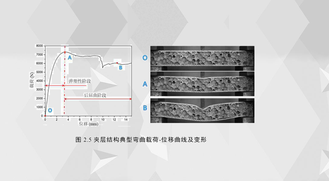 2.3失效模式和結(jié)構(gòu)響應圖2.5是泡沫鋁夾層結(jié)構(gòu)彎曲試驗典型的載荷-位移曲線和試件在三個特定位置的變形、破壞圖。根據(jù)載荷-位移曲線的初始拐點和變形、破壞程度,可將載荷-位移曲線分為兩個階段,兩個階段的臨界點位移對應的載荷稱為臨界失效模式的臨界載荷。第一階段為彈塑性階段,從O到A,此階段夾層結(jié)構(gòu)主要發(fā)生彈性變形,載荷與位移呈近似線性增長關(guān)系;第二階段為初始拐點至最終破壞,稱為后屈曲階段,此階段夾層結(jié)構(gòu)的局部或者整體發(fā)生明顯變形、破壞。