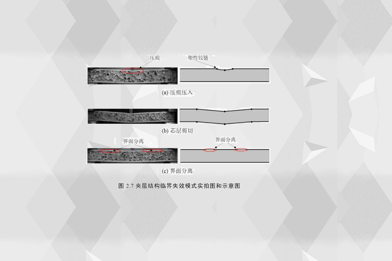 通過實驗觀察分析得出,泡沫夾層結構在彎曲工況下三種主要的臨界失效模式為壓痕壓入、芯層剪切和界面分離,如圖2.7所示。臨界失效模式壓痕壓入(IN)的主要特征是壓頭正下方部分夾層結構的上面板有鉸鏈并且附近的芯層有明顯的局部壓痕;通過圖2.7(a)可以觀測到,壓頭附近的上面板有三個鉸鏈,而在此時刻下面板的位移很小,基本可以忽略其位移量。如圖2.7(b)所示,臨界失效模式芯層剪切(CS) 的主要特征是上下面板位置平行,并且上下面板各有三個鉸鏈,鉸鏈的位置一個位于壓頭正下方,兩外兩個分別位于兩支撐端附近,該失效模式與Ashby等人在參考文獻中提到的ModeB類似。最后一種臨界失效模式為界面分離(DB),夾層結構膠粘劑的完整性確保了載荷在夾層結構各組成部分之間穩(wěn)定傳遞;根據(jù)剪切力互等定理,在臨界失效模式發(fā)生之前,泡沫芯層受到的剪切應力等于膠粘劑的剪切應力,但在僅涉及由剪切應力引起的臨界失效模式的情況下,如果夾層結構受到的最大剪切應力超過膠粘劑所能承受的剪切強度,但小于芯層所能承受的剪切強度,則可能會發(fā)生界面分離(DB)。
