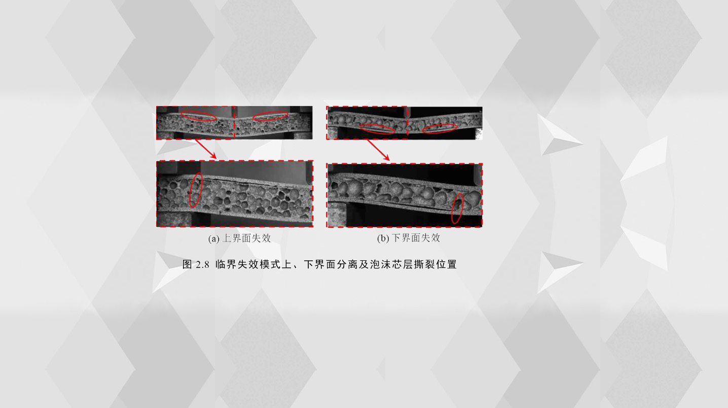 通過(guò)觀(guān)察,界面分離的主要特點(diǎn)是面板與膠膜分離并且膠膜緊緊地貼附在泡沫鋁上,界面分離的裂紋對(duì)稱(chēng)分布在壓頭的兩側(cè),并可能出現(xiàn)在上界面或下界面,如圖2.8(a)和(b)所示,圖中分別展示了上下界面分離時(shí),泡沫芯層出現(xiàn)撕裂的不同位置。由于CFRP和GFRP沒(méi)有鋁合金那樣明顯的塑性變形,因此纖維增強(qiáng)夾層結(jié)構(gòu)的臨界失效模式的壓痕壓入與鋁合金夾層結(jié)構(gòu)的略有不同,前者結(jié)構(gòu)的面板發(fā)生彈性變形,但后者主要發(fā)生塑性變形;通過(guò)分析兩者的載荷-位移曲線(xiàn),試件在臨界失效模式后,前者的載荷-位移曲線(xiàn)呈上升趨勢(shì),而后者則相反。本章所有試件的彎曲試件的臨界失效模式總結(jié)詳見(jiàn)表2.3;臨界失效模式壓痕壓入(IN)主要發(fā)生在A(yíng)L-F1、AL-H20和纖維增強(qiáng)夾層結(jié)構(gòu)試樣中(除CF-F2、CF-F1.5和GF-F2外);臨界失效模式芯層剪切(CS)出現(xiàn)在A(yíng)L-F2、AL-F1.5、AL-D25、CF-F2和CF- F1.5試件中;AL-H10和AL-D65出現(xiàn)臨界失效模式界面分離(DB)。出乎意料的是,在GF-F2中觀(guān)察到幾乎同時(shí)存在兩種臨界破壞模式,即芯層剪切(CS)和壓痕壓入(IN)。因此,面板厚度、芯層高度對(duì)夾層結(jié)構(gòu)的臨界失效模式有很大影響,隨著夾層結(jié)構(gòu)面板厚度增加,試樣的剛度增加,結(jié)構(gòu)的承載力增強(qiáng),臨界失效模式從IN變?yōu)镃S;此外,不同密度的泡沫芯層胞元大小不同,并且面板與芯層之間界面結(jié)合強(qiáng)度有很大差異,隨著芯層密度的增加,芯層胞元變小,面板和泡沫芯層之間膠粘劑剪切強(qiáng)度變小,夾層結(jié)構(gòu)的臨界失效模式由CS逐漸變?yōu)镈B。