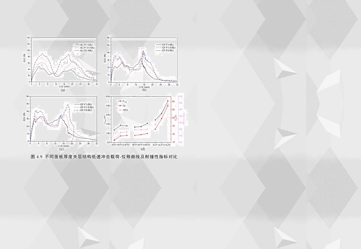 為了研究夾層結(jié)構(gòu)的面板厚度對(duì)沖擊性能的影響,圖4.9(a)-(c)比較了三種不同面板厚度的夾層結(jié)構(gòu)的載荷-位移曲線。無(wú)論是彈塑性面板還是脆性面板,夾層結(jié)構(gòu)的面板厚度對(duì)其低速?zèng)_擊響應(yīng)均有較大影響。為了更直觀地比較,圖4.9(d)對(duì)比了不同面板厚度夾層結(jié)構(gòu)的耐撞性指標(biāo),通過(guò)觀察,鋁合金夾層結(jié)構(gòu)的耐撞性能隨面板厚度增加而明顯增加,面板厚度從1mm增加到2mm,其初始峰值載荷、穿透吸能和比穿透吸能分別提高了84%、108%和54%;對(duì)玻璃纖維夾層結(jié)構(gòu)而言,當(dāng)面板厚度從1mm增加到2mm,其初始峰值載荷和穿透吸能分別只提高了24%和13%,而面板厚度的增加對(duì)比穿透吸能的影響效果差異不大;而對(duì)碳纖維夾層結(jié)構(gòu)而言,當(dāng)面板厚度從1mm增加到2mm,其穿透吸能和比穿透能分別提高了42%和33%,并且隨著層數(shù)的增加,耐撞性指標(biāo)增加的幅度大幅減小。